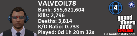 <a href="http://GTAonlinestats.com/showplayer/VALVEOIL78/2"><img src="http://GTAonlinestats.com/greysignature/VALVEOIL78/2/sig.png" alt="VALVEOIL78" border="0" /></a>