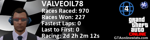 [URL=http://GTAonlinestats.com/showplayer/VALVEOIL78/2][IMG]http://GTAonlinestats.com/racesignature/VALVEOIL78/2/sig.png[/IMG][/URL]