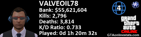 [URL=http://GTAonlinestats.com/showplayer/VALVEOIL78/2][IMG]http://GTAonlinestats.com/signature/VALVEOIL78/2/sig.png[/IMG][/URL]