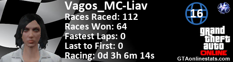 <a href="http://GTAonlinestats.com/showplayer/Vagos_MC-Liav/3"><img src="http://GTAonlinestats.com/racesignature/Vagos_MC-Liav/3/sig.png" alt="Vagos_MC-Liav" border="0" /></a>