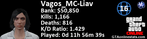 [URL=http://GTAonlinestats.com/showplayer/Vagos_MC-Liav/3][IMG]http://GTAonlinestats.com/signature/Vagos_MC-Liav/3/sig.png[/IMG][/URL]