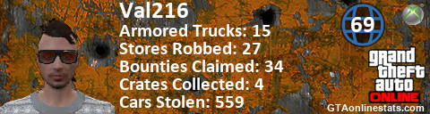 [URL=http://GTAonlinestats.com/showplayer/Val216][IMG]http://GTAonlinestats.com/crimesignature/Val216/sig.png[/IMG][/URL]