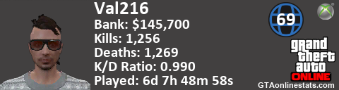 <a href="http://GTAonlinestats.com/showplayer/Val216"><img src="http://GTAonlinestats.com/signature/Val216/sig.png" alt="Val216" border="0" /></a>