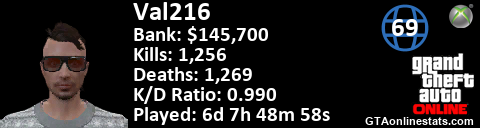 [URL=http://GTAonlinestats.com/showplayer/Val216][IMG]http://GTAonlinestats.com/signature/Val216/sig.png[/IMG][/URL]