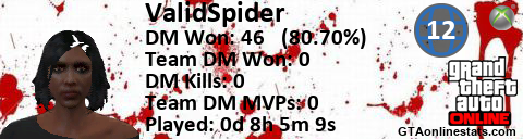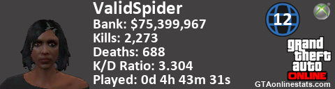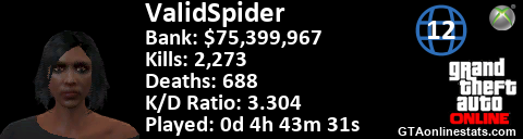 [URL=http://GTAonlinestats.com/showplayer/ValidSpider/2][IMG]http://GTAonlinestats.com/dmsignature/ValidSpider/2/sig.png[/IMG][/URL]