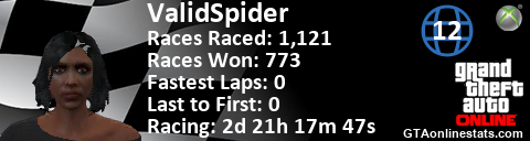 [URL=http://GTAonlinestats.com/showplayer/ValidSpider/2][IMG]http://GTAonlinestats.com/racesignature/ValidSpider/2/sig.png[/IMG][/URL]