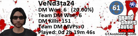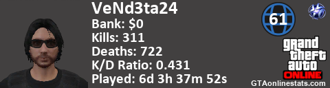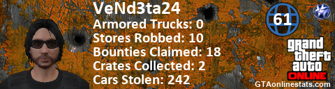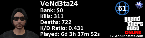 [URL=http://GTAonlinestats.com/showplayer/VeNd3ta24][IMG]http://GTAonlinestats.com/signature/VeNd3ta24/sig.png[/IMG][/URL]