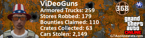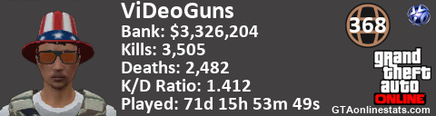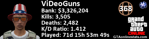 <a href="http://GTAonlinestats.com/showplayer/ViDeoGuns"><img src="http://GTAonlinestats.com/signature/ViDeoGuns/sig.png" alt="ViDeoGuns" border="0" /></a>