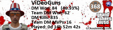 [URL=http://GTAonlinestats.com/showplayer/ViDeoGuns][IMG]http://GTAonlinestats.com/dmsignature/ViDeoGuns/sig.png[/IMG][/URL]