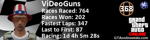 <a href="http://GTAonlinestats.com/showplayer/ViDeoGuns"><img src="http://GTAonlinestats.com/racesignature/ViDeoGuns/sig.png" alt="ViDeoGuns" border="0" /></a>