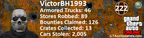 <a href="http://GTAonlinestats.com/showplayer/VictorBH1993"><img src="http://GTAonlinestats.com/signature/VictorBH1993/sig.png" alt="VictorBH1993" border="0" /></a>