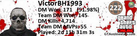 [URL=http://GTAonlinestats.com/showplayer/VictorBH1993][IMG]http://GTAonlinestats.com/dmsignature/VictorBH1993/sig.png[/IMG][/URL]