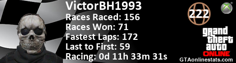 [URL=http://GTAonlinestats.com/showplayer/VictorBH1993][IMG]http://GTAonlinestats.com/racesignature/VictorBH1993/sig.png[/IMG][/URL]