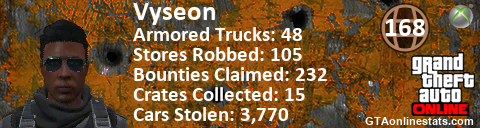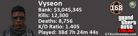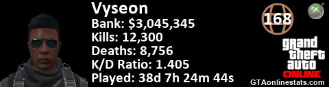 [URL=http://GTAonlinestats.com/showplayer/Vyseon][IMG]http://GTAonlinestats.com/randomsignature/Vyseon/sig.png[/IMG][/URL]