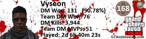 [URL=http://GTAonlinestats.com/showplayer/Vyseon][IMG]http://GTAonlinestats.com/dmsignature/Vyseon/sig.png[/IMG][/URL]