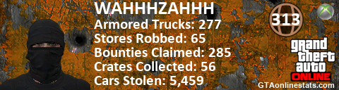 [URL=http://GTAonlinestats.com/showplayer/WAHHHZAHHH][IMG]http://GTAonlinestats.com/crimesignature/WAHHHZAHHH/sig.png[/IMG][/URL]