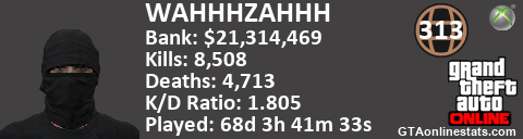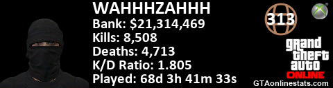 [URL=http://GTAonlinestats.com/showplayer/WAHHHZAHHH][IMG]http://GTAonlinestats.com/signature/WAHHHZAHHH/sig.png[/IMG][/URL]