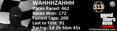 [URL=http://GTAonlinestats.com/showplayer/WAHHHZAHHH][IMG]http://GTAonlinestats.com/racesignature/WAHHHZAHHH/sig.png[/IMG][/URL]
