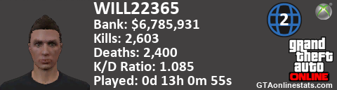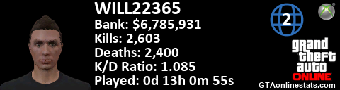 [URL=http://GTAonlinestats.com/showplayer/WILL22365/2][IMG]http://GTAonlinestats.com/signature/WILL22365/2/sig.png[/IMG][/URL]
