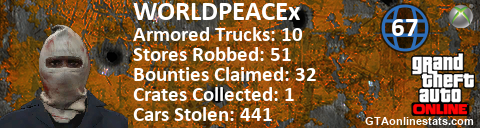 [URL=http://GTAonlinestats.com/showplayer/WORLDPEACEx][IMG]http://GTAonlinestats.com/crimesignature/WORLDPEACEx/sig.png[/IMG][/URL]