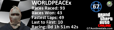 <a href="http://GTAonlinestats.com/showplayer/WORLDPEACEx"><img src="http://GTAonlinestats.com/racesignature/WORLDPEACEx/sig.png" alt="WORLDPEACEx" border="0" /></a>