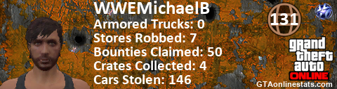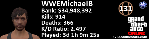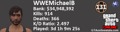 [URL=http://GTAonlinestats.com/showplayer/WWEMichaelB][IMG]http://GTAonlinestats.com/signature/WWEMichaelB/sig.png[/IMG][/URL]