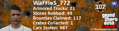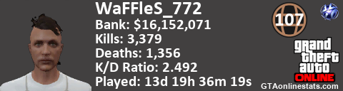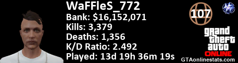 [URL=http://GTAonlinestats.com/showplayer/WaFFleS_772][IMG]http://GTAonlinestats.com/signature/WaFFleS_772/sig.png[/IMG][/URL]
