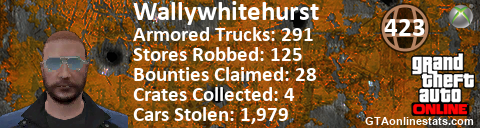 [URL=http://GTAonlinestats.com/showplayer/Wallywhitehurst][IMG]http://GTAonlinestats.com/randomsignature/Wallywhitehurst/sig.png[/IMG][/URL]
