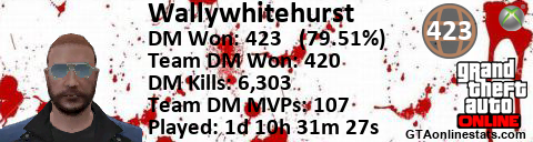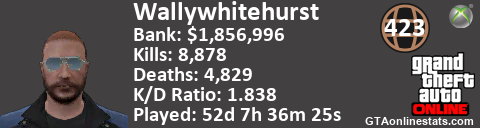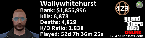 [URL=http://GTAonlinestats.com/showplayer/Wallywhitehurst][IMG]http://GTAonlinestats.com/dmsignature/Wallywhitehurst/sig.png[/IMG][/URL]