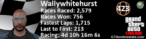 [URL=http://GTAonlinestats.com/showplayer/Wallywhitehurst][IMG]http://GTAonlinestats.com/racesignature/Wallywhitehurst/sig.png[/IMG][/URL]