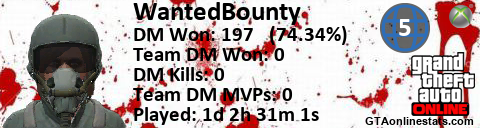 [URL=http://GTAonlinestats.com/showplayer/WantedBounty/5][IMG]http://GTAonlinestats.com/dmsignature/WantedBounty/5/sig.png[/IMG][/URL]