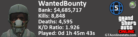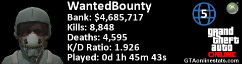 [URL=http://GTAonlinestats.com/showplayer/WantedBounty/5][IMG]http://GTAonlinestats.com/signature/WantedBounty/5/sig.png[/IMG][/URL]