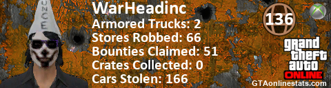 [URL=http://GTAonlinestats.com/showplayer/WarHeadinc][IMG]http://GTAonlinestats.com/crimesignature/WarHeadinc/sig.png[/IMG][/URL]