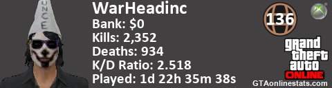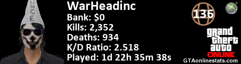 <a href="http://GTAonlinestats.com/showplayer/WarHeadinc"><img src="http://GTAonlinestats.com/dmsignature/WarHeadinc/sig.png" alt="WarHeadinc" border="0" /></a>