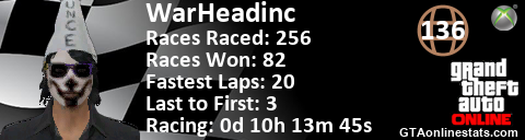 [URL=http://GTAonlinestats.com/showplayer/WarHeadinc][IMG]http://GTAonlinestats.com/racesignature/WarHeadinc/sig.png[/IMG][/URL]
