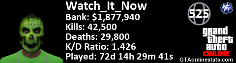 [URL=http://GTAonlinestats.com/showplayer/Watch_It_Now][IMG]http://GTAonlinestats.com/signature/Watch_It_Now/sig.png[/IMG][/URL]