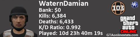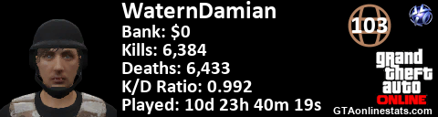[URL=http://GTAonlinestats.com/showplayer/WaternDamian][IMG]http://GTAonlinestats.com/signature/WaternDamian/sig.png[/IMG][/URL]