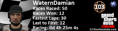 [URL=http://GTAonlinestats.com/showplayer/WaternDamian][IMG]http://GTAonlinestats.com/racesignature/WaternDamian/sig.png[/IMG][/URL]