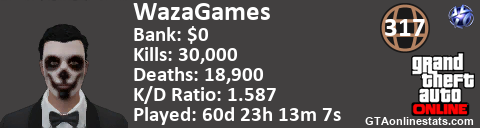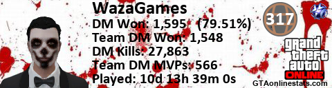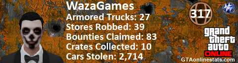 [URL=http://GTAonlinestats.com/showplayer/WazaGames][IMG]http://GTAonlinestats.com/signature/WazaGames/sig.png[/IMG][/URL]