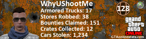 [URL=http://GTAonlinestats.com/showplayer/WhyUShootMe][IMG]http://GTAonlinestats.com/crimesignature/WhyUShootMe/sig.png[/IMG][/URL]