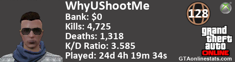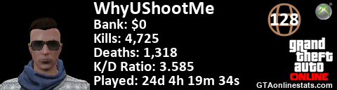 <a href="http://GTAonlinestats.com/showplayer/WhyUShootMe"><img src="http://GTAonlinestats.com/dmsignature/WhyUShootMe/sig.png" alt="WhyUShootMe" border="0" /></a>