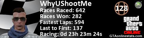 [URL=http://GTAonlinestats.com/showplayer/WhyUShootMe][IMG]http://GTAonlinestats.com/racesignature/WhyUShootMe/sig.png[/IMG][/URL]