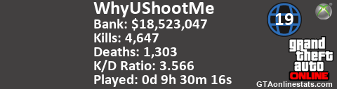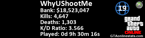 [URL=http://GTAonlinestats.com/showplayer/WhyUShootMe/2][IMG]http://GTAonlinestats.com/signature/WhyUShootMe/2/sig.png[/IMG][/URL]