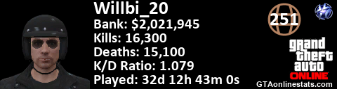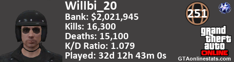 [URL=http://GTAonlinestats.com/showplayer/Willbi_20][IMG]http://GTAonlinestats.com/greysignature/Willbi_20/sig.png[/IMG][/URL]