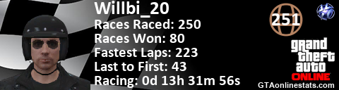[URL=http://GTAonlinestats.com/showplayer/Willbi_20][IMG]http://GTAonlinestats.com/racesignature/Willbi_20/sig.png[/IMG][/URL]