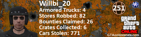 [URL=http://GTAonlinestats.com/showplayer/Willbi_20][IMG]http://GTAonlinestats.com/crimesignature/Willbi_20/sig.png[/IMG][/URL]