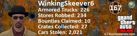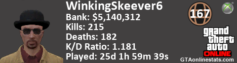 <a href="http://GTAonlinestats.com/showplayer/WinkingSkeever6"><img src="http://GTAonlinestats.com/signature/WinkingSkeever6/sig.png" alt="WinkingSkeever6" border="0" /></a>