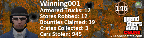 [URL=http://GTAonlinestats.com/showplayer/Winning001][IMG]http://GTAonlinestats.com/crimesignature/Winning001/sig.png[/IMG][/URL]