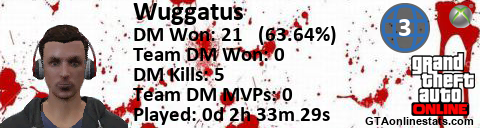 [URL=http://GTAonlinestats.com/showplayer/Wuggatus/2][IMG]http://GTAonlinestats.com/dmsignature/Wuggatus/2/sig.png[/IMG][/URL]
