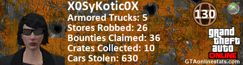 [URL=http://GTAonlinestats.com/showplayer/X0SyKotic0X][IMG]http://GTAonlinestats.com/crimesignature/X0SyKotic0X/sig.png[/IMG][/URL]